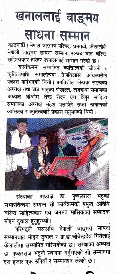 नेपाल वाङमय परिषद्, धनगढीले आज दिउँसो राजधानीमा एक समारोहका बीच साहित्यकार हरिहर खनाललाई ‘नेपाली वाङमय साधना सम्मान’ प्रदान गरेको छ |