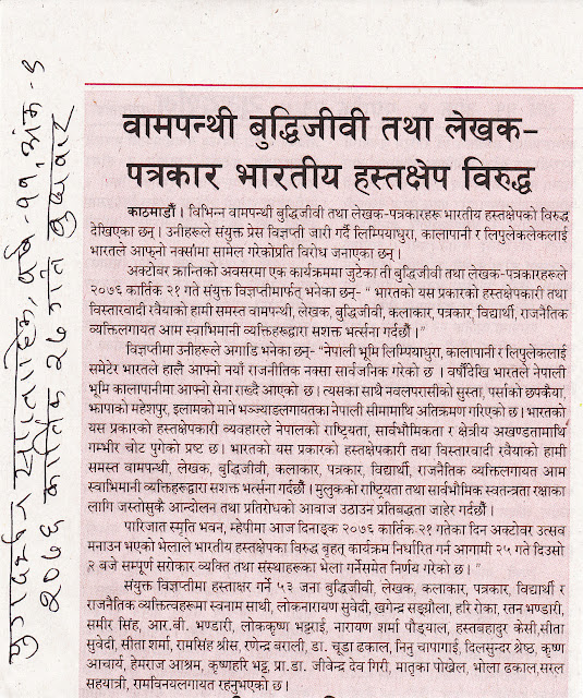 भारतीय हस्तक्षेपको विरोधमा जारी संयुक्त विज्ञप्तिमा भनिएको छ, ‘भारतको यस प्रकारको हस्तक्षेपकारी व्यवहारले नेपालको राष्ट्रियता, सार्वभौमिकता र क्षेत्रीय अखण्डतामाथि गम्भीर चोट पुगेको प्रष्ट छ । भारतको यसप्रकारको हस्तक्षेपकारी तथा विस्तारवादी रवैयाको हामी समस्त बामपन्थी, लेखक, बुद्धिजीवी, कलाकार, पत्रकार, विद्यार्थी, राजनैतिक व्यक्ति लगायत आम स्वाभिमान् व्यक्तिहरूद्वारा सशक्त भर्त्सना गर्दछौं ।’